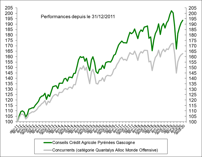 Par rapport à nos concurrents (catégorie Quantalys allocation Monde offensive) notre avance est de +30,6%, avec une performance globale de +93,5% depuis le 31/12/2011. Résultats de nos conseils d’investissements au 31/07/2020 :