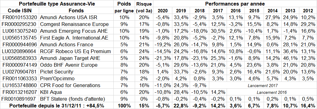 Comme chaque mois, voici le tableau des performances des investissements que nous conseillons : nous avons investi 100 000 euros sur chaque portefeuille type au 31 Décembre 2011, et nous donnons donc la performance du portefeuille et de chaque ligne pour les supports PEA et assurance-vie (Floriane et Espace Liberté) au 31/07/2020.