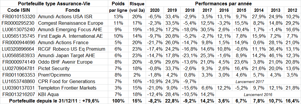 Comme chaque mois, voici le tableau des performances des investissements que nous conseillons : nous avons investi 100 000 euros sur chaque portefeuille type au 31 Décembre 2011, et nous donnons donc la performance du portefeuille et de chaque ligne pour les supports PEA et assurance-vie (Floriane et Espace Liberté) au 29/05/2020.