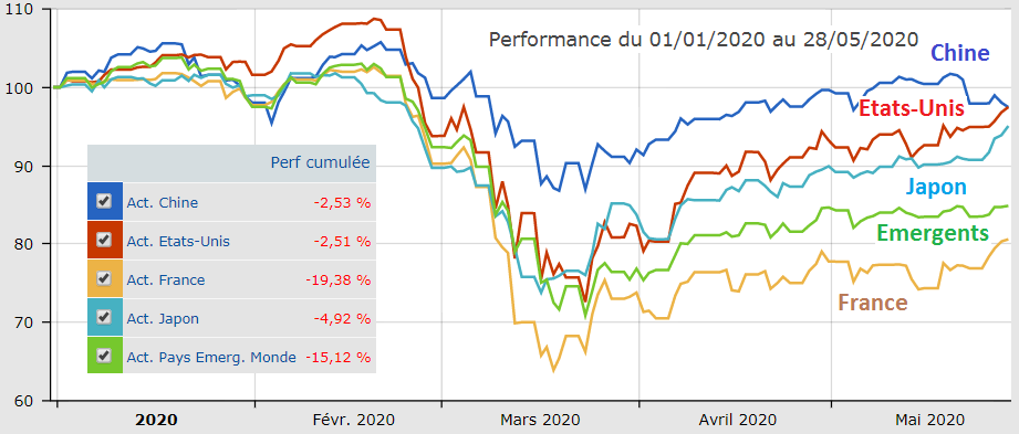 - Les tensions géopolitiques, notamment Chine-Etats-Unis qui augmentent de nouveau après une période relativement plus calme (mise en cause et responsabilité de la Chine dans cette pandémie mondiale, nouvelles tensions à Hong-Kong, dossier Huawei, cours du Yuan, etc.).